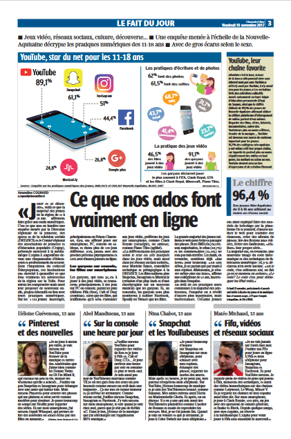 23 novembre 2017 educpopnum Articles 2024 Le Journal de l’Animation: « Il faut recréer du collectif Charente Libre : "Derrière leurs écrans, des jeunes de plus en plus prudents" RCF Radio : "[3 questions À] Siegfried Burgeot, chef de projet Info jeunesse 2017 Charente Libre : "Ce que nos ados font vraiment en ligne" Cairn.Info : "EducPopNum ou la constitution d'un Collectif Régional d’Éducation Populaire (au) Numérique"